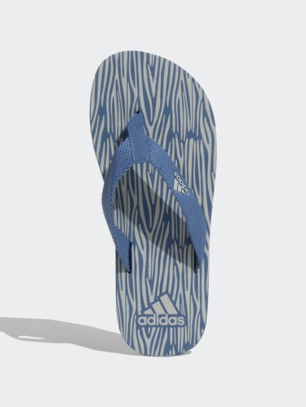 Adidas Adilette Comfort Flip-Flops in blue and white pattern. Comfortable and stylish for summer.