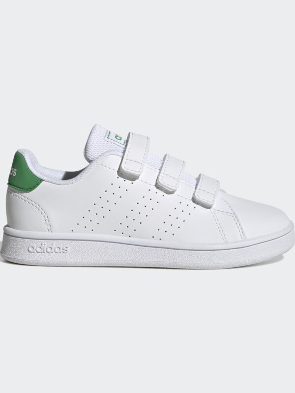 Clean and classic all-white Adidas Advantage CF Kids Shoes, featuring dual hook-and-loop straps and perforated details.