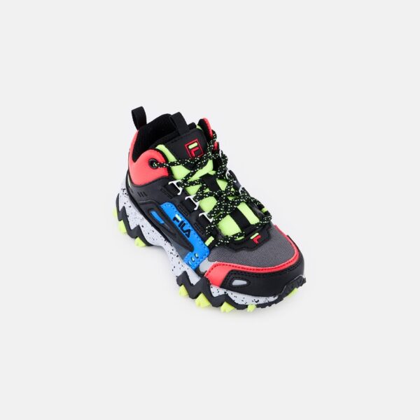 Vibrant Fila Kids’ Trailblazer sneakers featuring a multi-color design with neon yellow laces and a chunky, speckled sole, perfect for active and stylish young adventurers.