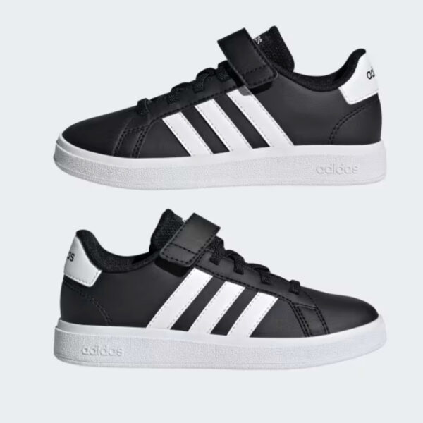 Kids' Adidas Grand Court sneakers with a hook-and-loop strap for easy on and off, offering classic style and comfort for active kids.