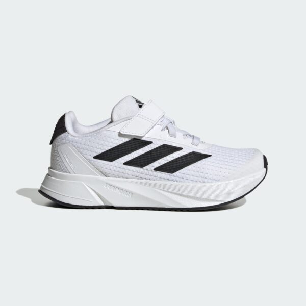Lightweight and comfortable Adidas Response Flow Kids Running Shoes in white and black, featuring a hook-and-loop strap for easy wear.