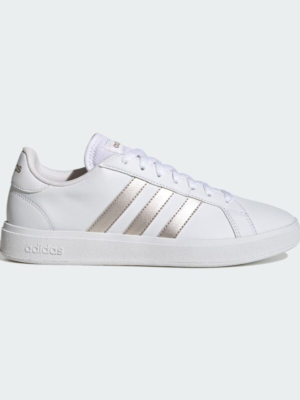 Classic Adidas Grand Court Base 2.0 sneakers in white and silver for women.