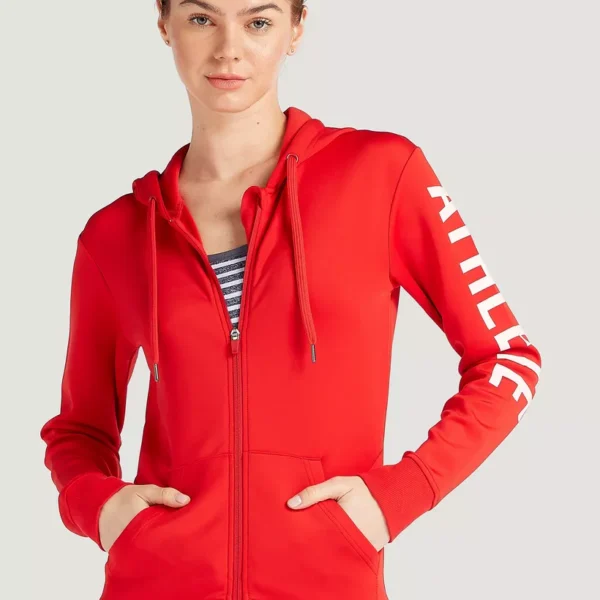 Red Splash Active zip-up hoodie with white logo print on the sleeve.