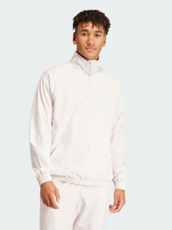 Light pink Adidas Future Icons half-zip sweatshirt with white logo details on the chest and sleeves, and a kangaroo pocket.