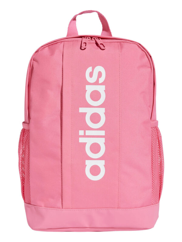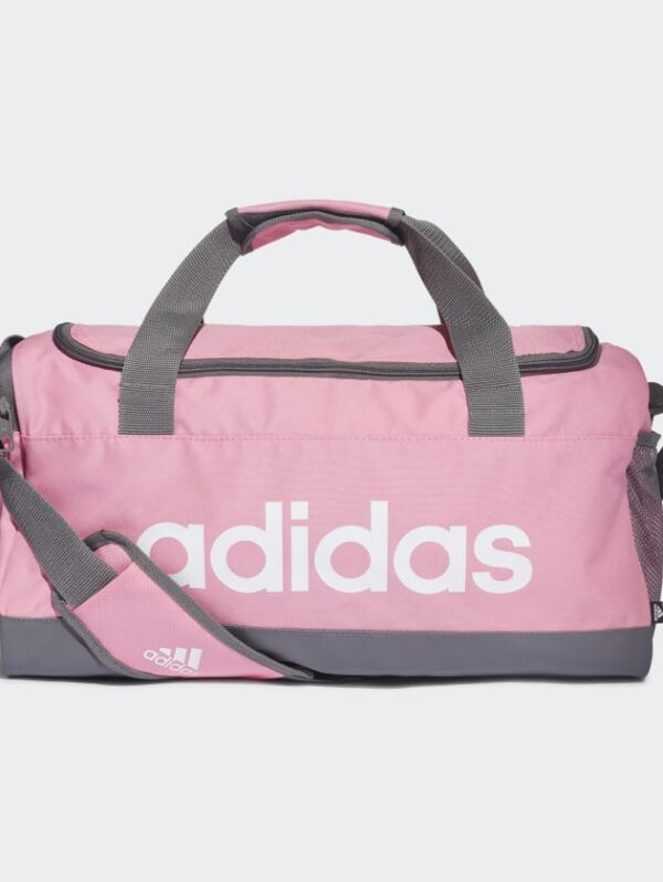 Pink Adidas duffel bag with logo, ideal for gym or travel.