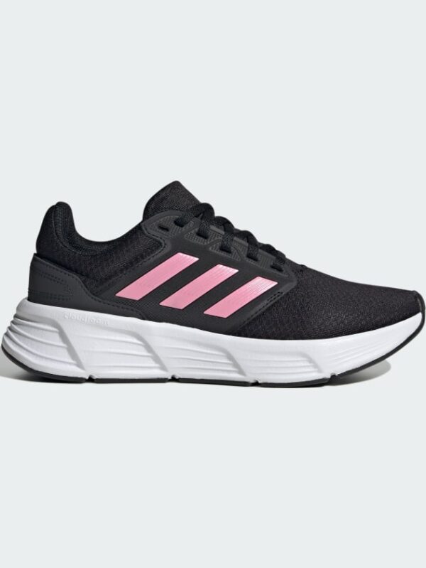 Comfortable and stylish Adidas Galaxy 6 women's running shoes in black with pink stripes and a supportive Cloudfoam midsole.