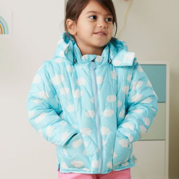 Tchibo: Cute light blue hooded puffer jacket with a white cloud print. Warm and practical for kids.