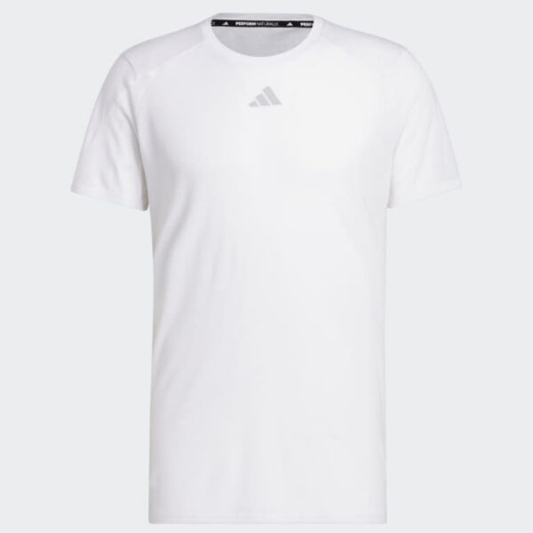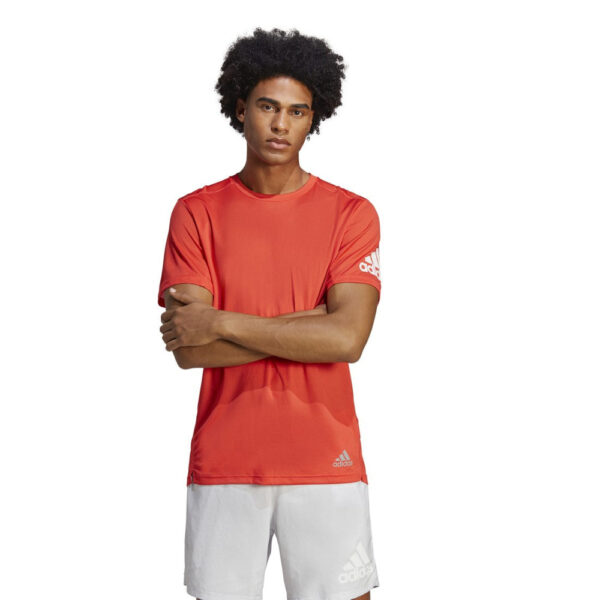 Vibrant pink Adidas Run Icons t-shirt with a dark grey 3 Bar logo, designed for running with comfortable, possibly moisture-wicking, fabric and reflective details.