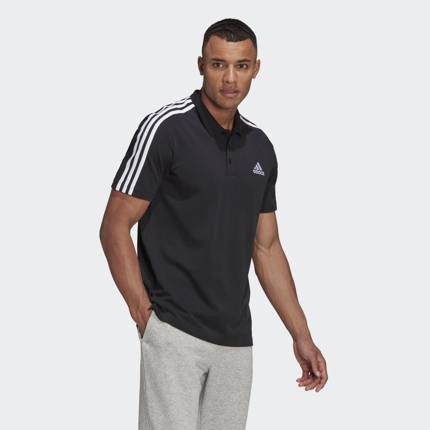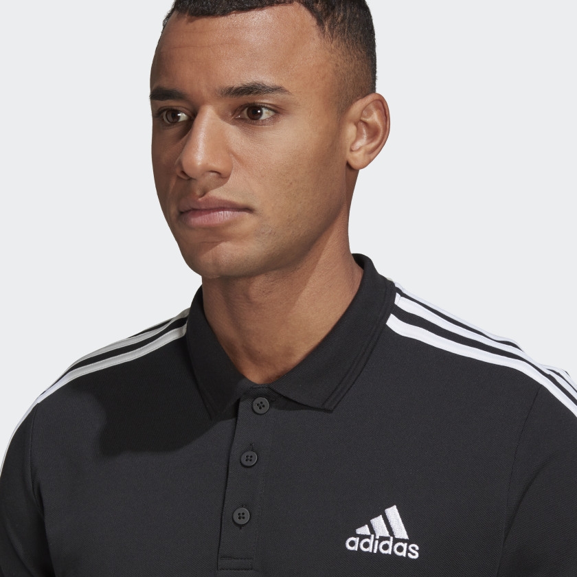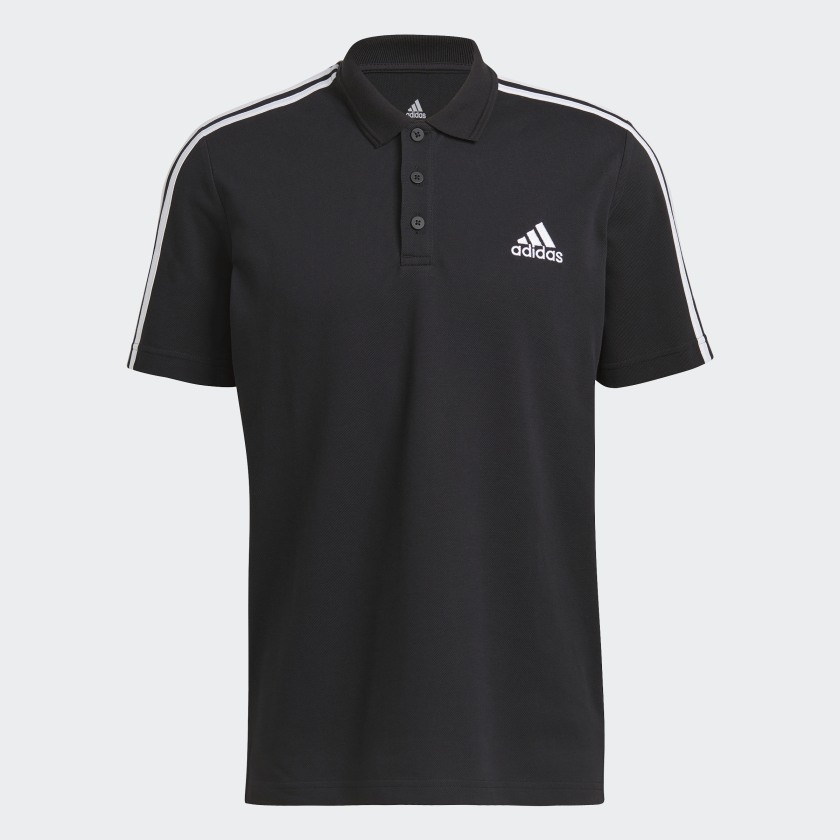 This black Adidas men’s polo shirt features the iconic three white stripes on the shoulders. Made with Aeroready technology, it helps keep you dry and comfortable. It has a classic polo collar with a three-button placket and the Adidas logo on the right chest. This shirt is a versatile choice for sports or casual wear.