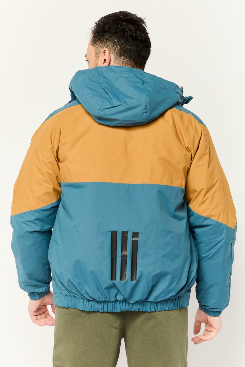 This stylish Adidas hooded jacket is part of the Adventure line, offering a retro-inspired, outdoor look with signature comfort and quality. It features a striking color-block design, combining a vibrant teal/petrol blue main body with contrasting mustard yellow accents across the shoulders, upper chest, and inner hood—a nod to classic ’90s sportswear. Built with insulated material for superior warmth, this jacket is ideal for chilly adventures or urban wear. It includes a full zip closure with a protective storm flap, an adjustable drawcord hood, and elasticized cuffs to seal in heat. Finished with practical zippered pockets, this coat effortlessly merges heritage aesthetics with functional performance expected from Adidas.