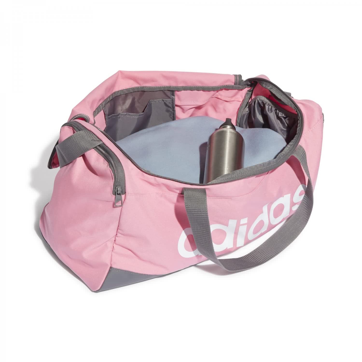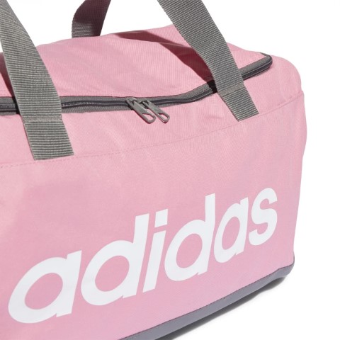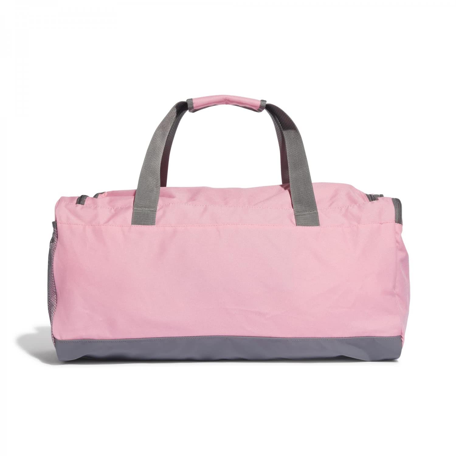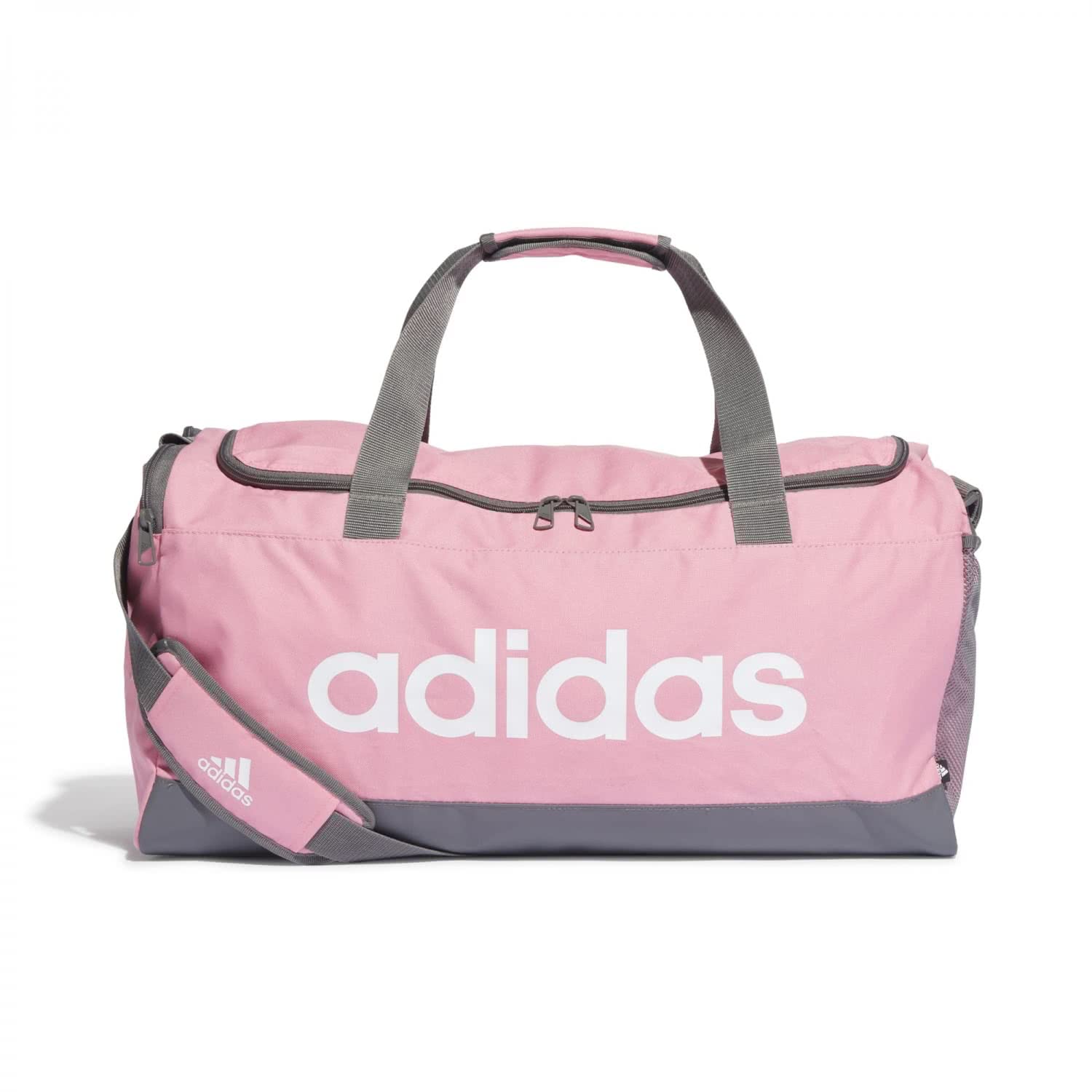 Organize your fitness life with the adidas Essentials Linear Duffel Bag. This sporty, high-performance bag is designed for the modern athlete who needs a reliable way to carry gear from work to the gym. The bag features a vibrant pink main body contrasted with sleek grey accents and the iconic bold white adidas linear logo across the front.