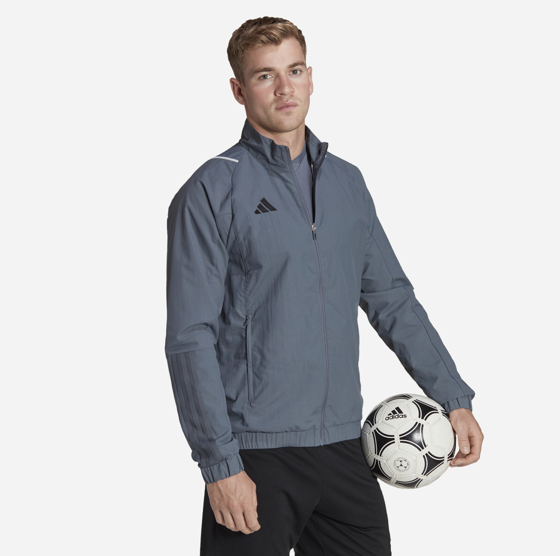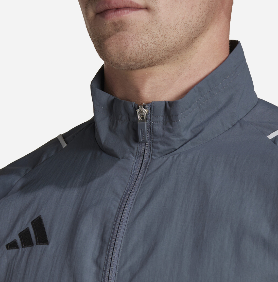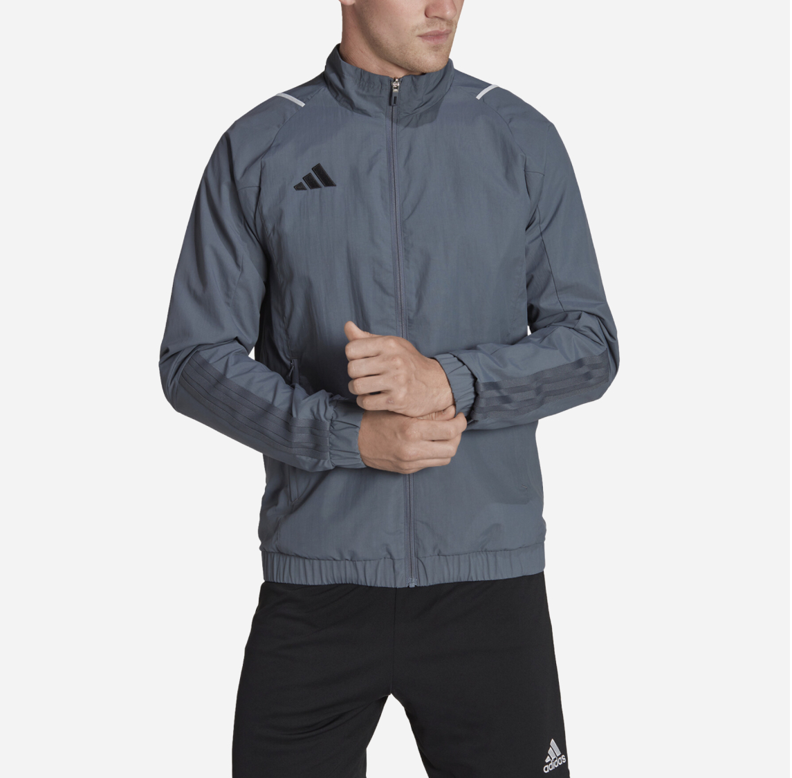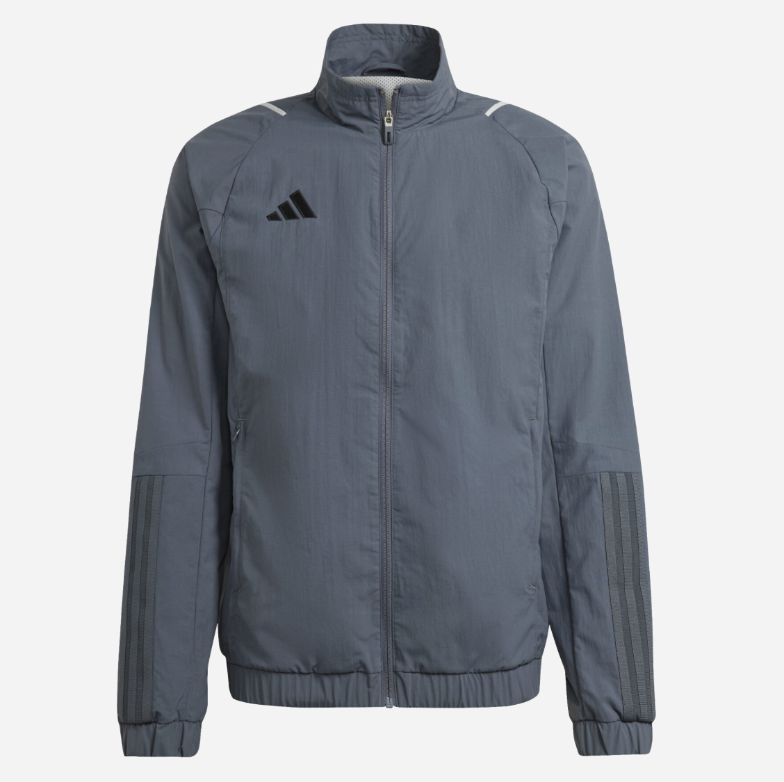 Look sharp and professional off the pitch with the Adidas Tiro 23 Competition Presentation Jacket. Designed for players to wear while traveling, standing on the sidelines, or between matches, this jacket offers a clean, streamlined aesthetic. It features a full zip with a stand-up collar and is made from a smooth, recycled nylon plain weave fabric in a deep Team Onix (dark grey/blue) color. The jacket includes a breathable mesh lining for all-day comfort and zipped front pockets for securely storing essentials. The signature Adidas 3-Stripes are subtly tonal on the lower arms, complemented by the black Adidas 3-Bar logo on the chest and contrasting white shoulder details. It’s a slim-fit jacket that keeps your look neat, sporty, and prepared.