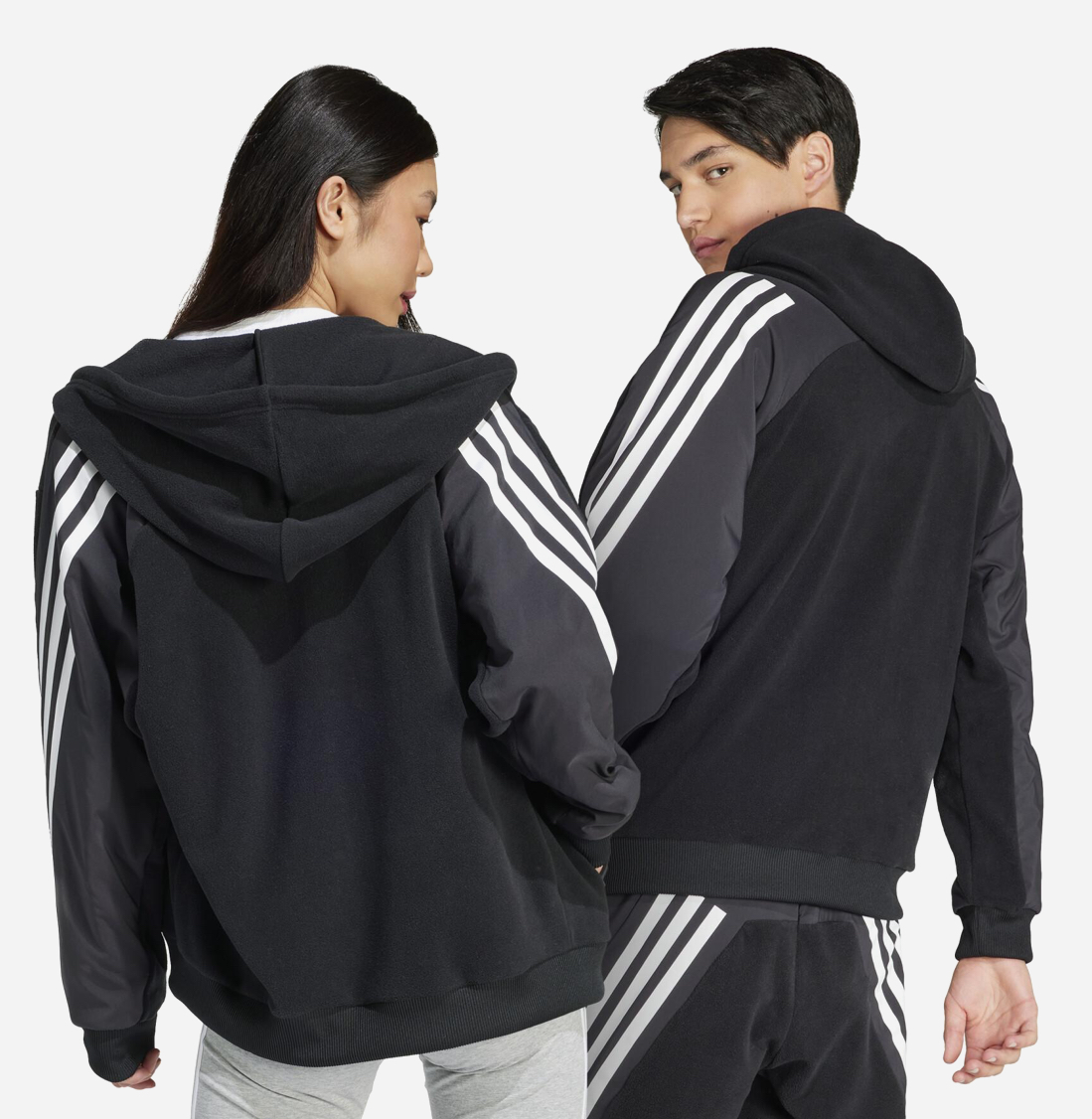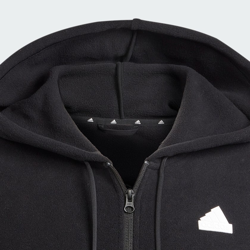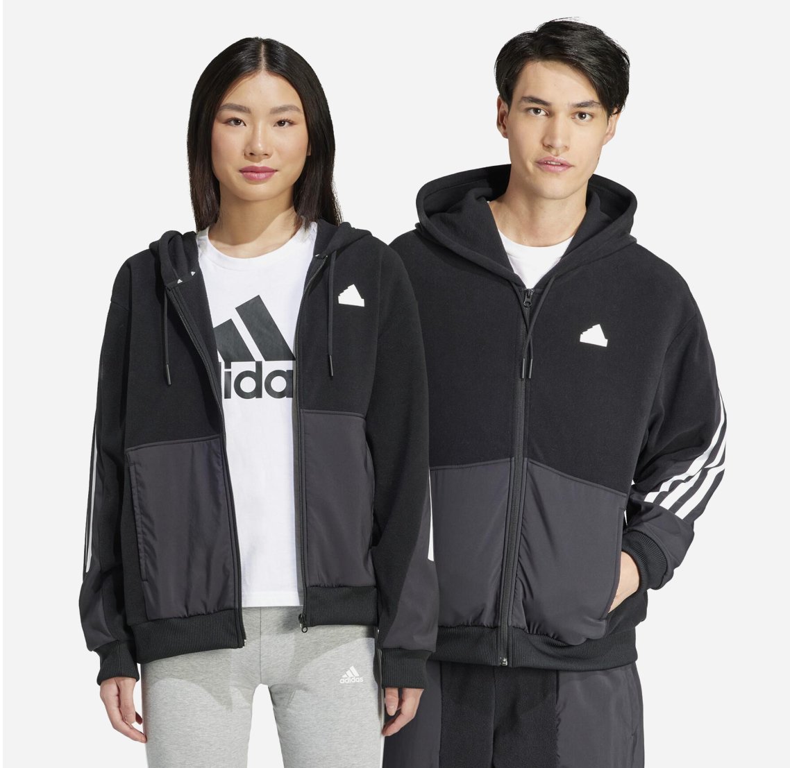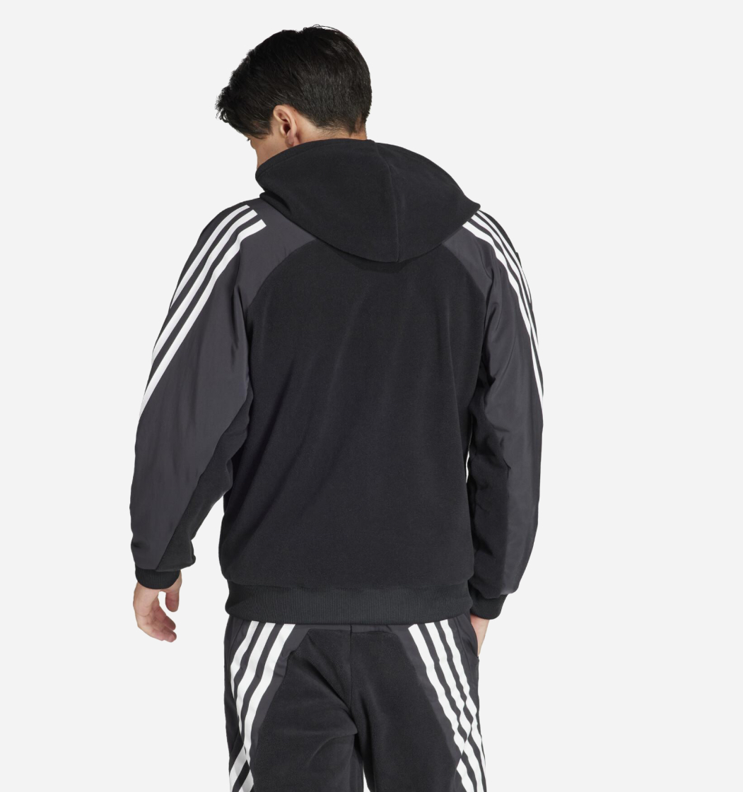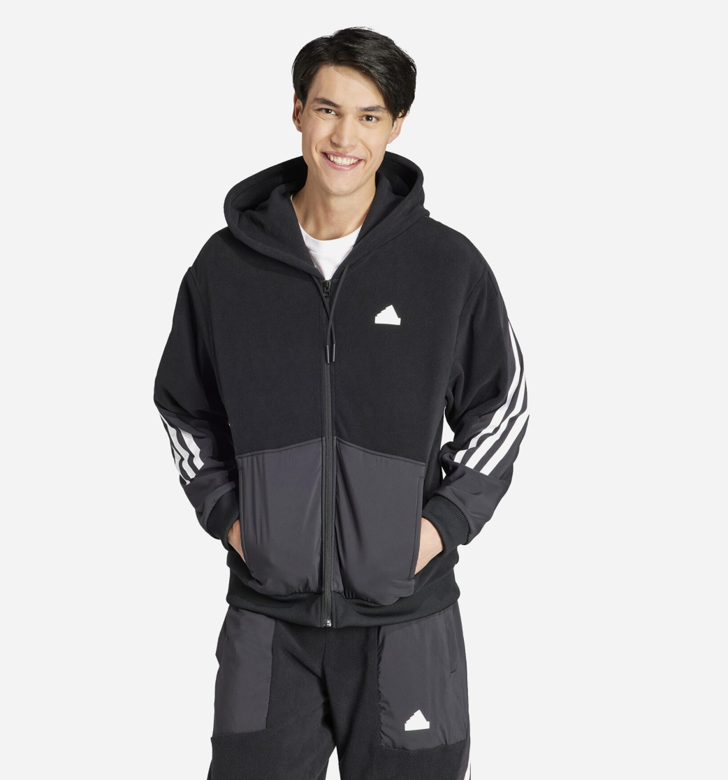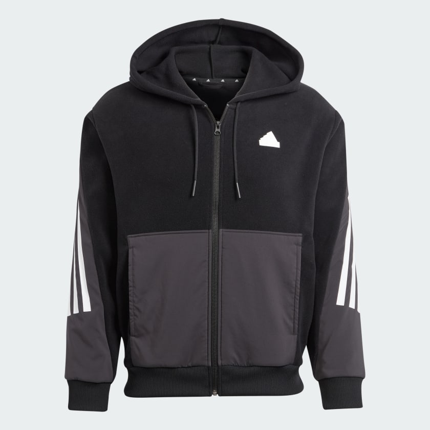 Embrace the modern athletic look with the adidas Future Icons Full-Zip . This unique piece redefines the classic hoodie by blending materials for both style and utility: the upper body and hood are crafted from soft, cozy black fleece, while the lower panel and sleeves feature a durable grey woven/nylon overlay for a functional, street-ready aesthetic.
