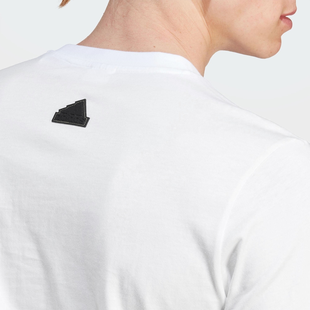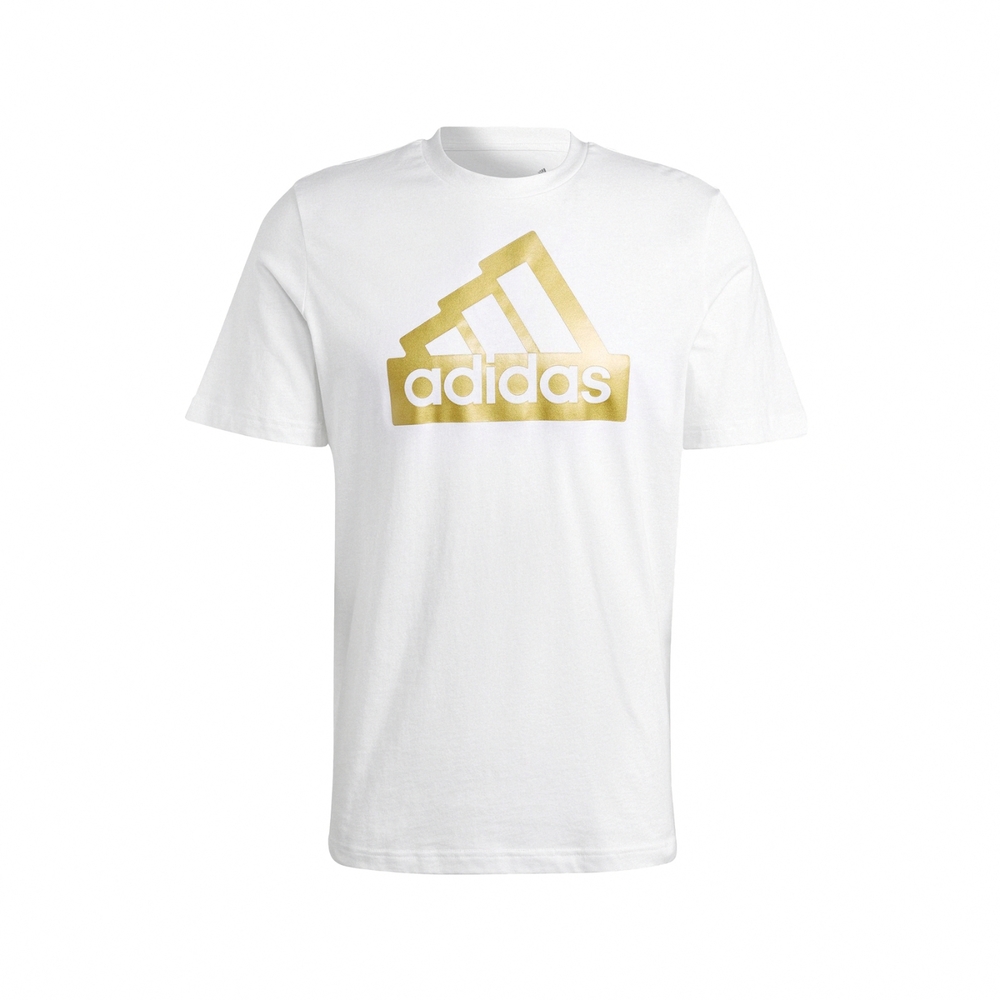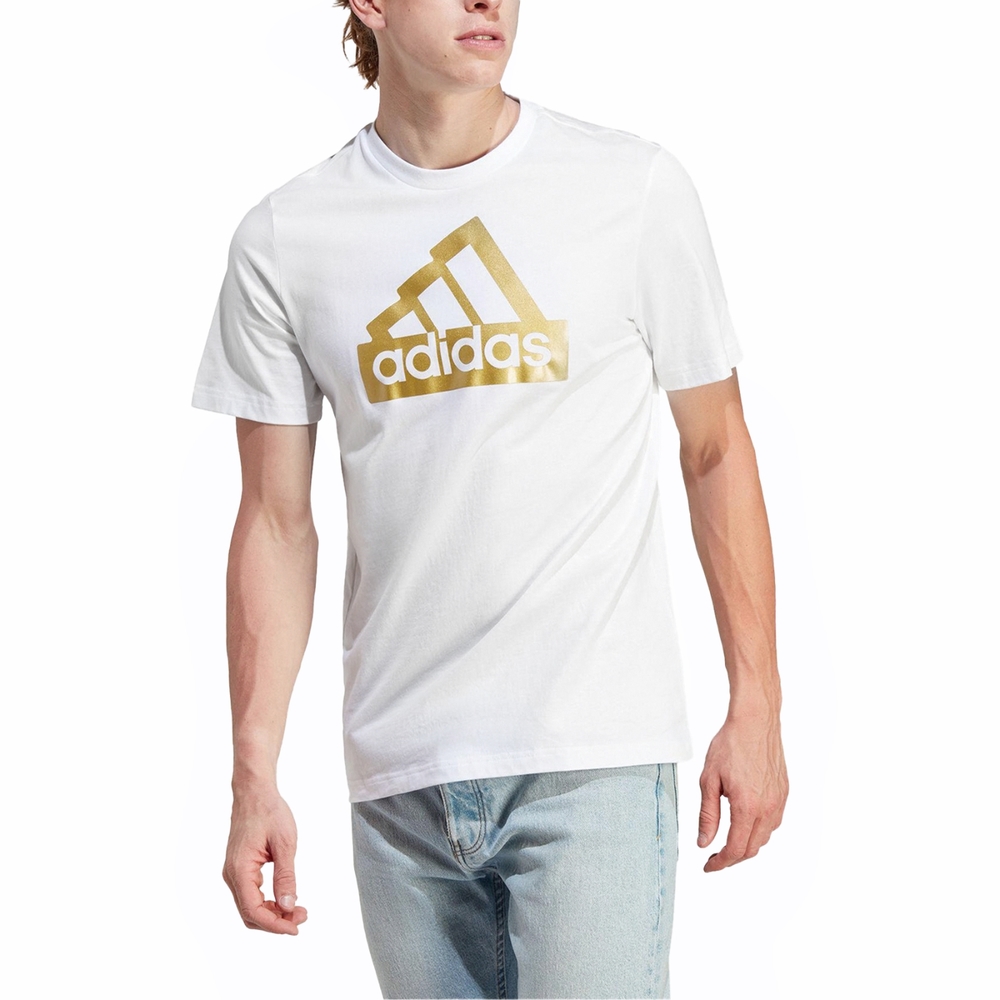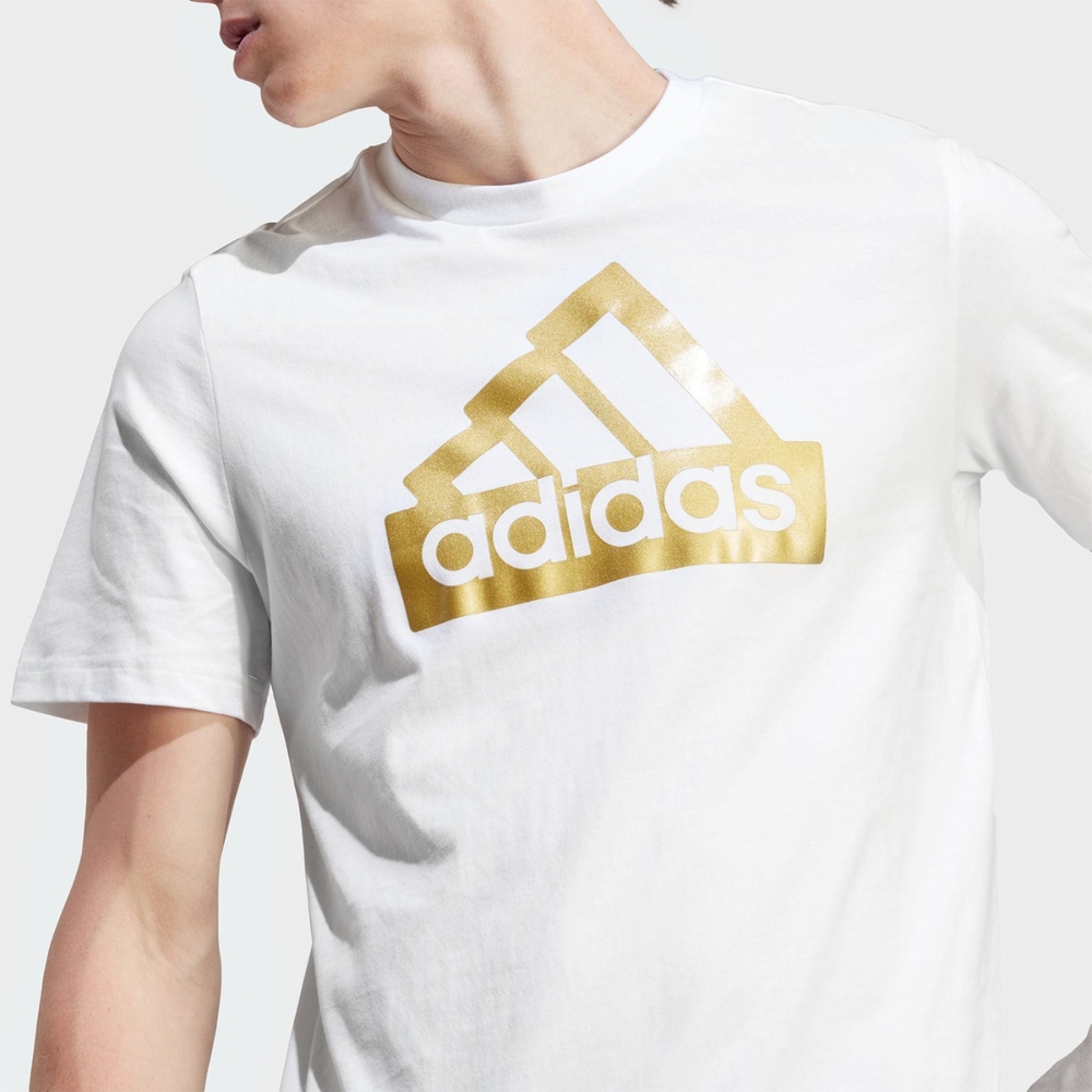 Shine bright with the Adidas Sportswear Future Icons Metallic Badge of Sport T-Shirt in crisp white. This stylish tee features a large, eye-catching metallic gold Adidas Badge of Sport logo prominently displayed on the chest, adding a touch of luxury and flair to a classic design. Crafted from comfortable and soft fabric, this t-shirt is perfect for both casual wear and light activities, offering a blend of sporty aesthetics and everyday comfort. The bold metallic logo makes a statement, ensuring you stand out.