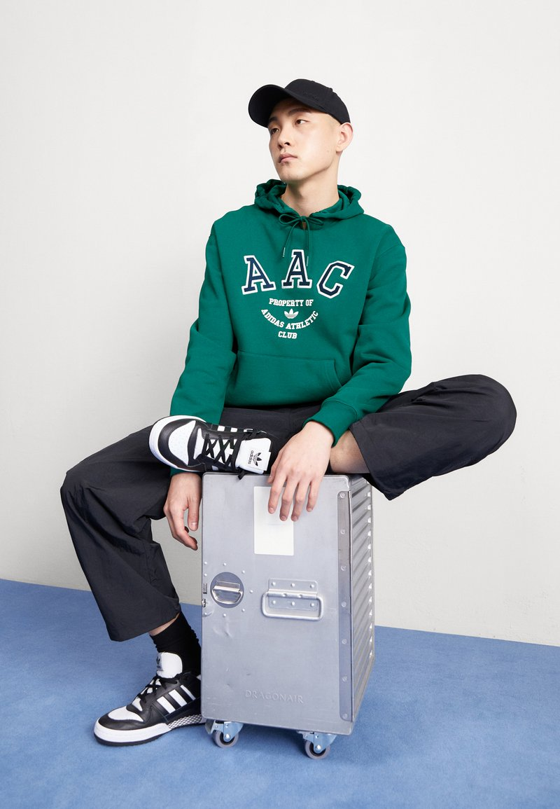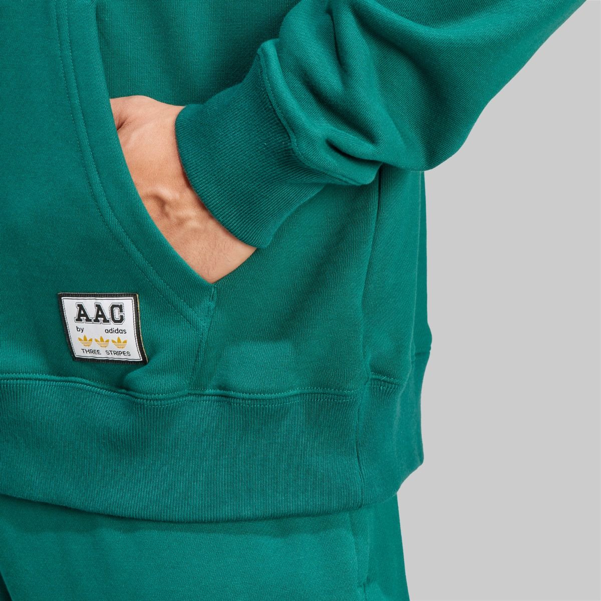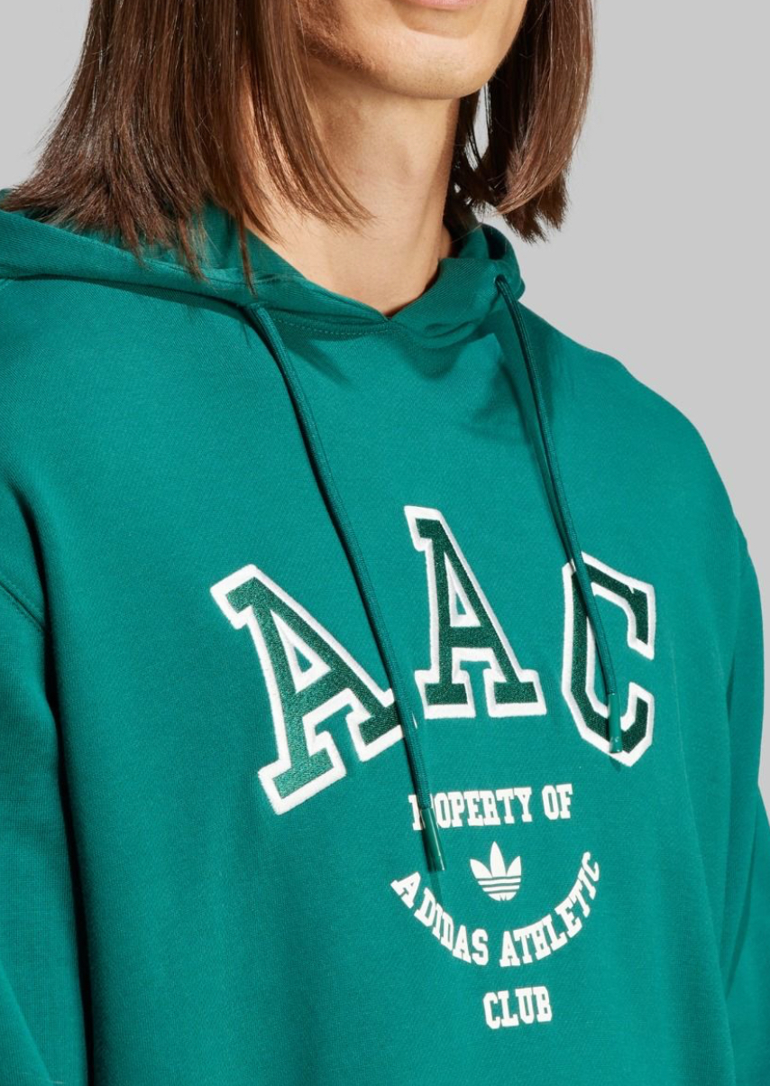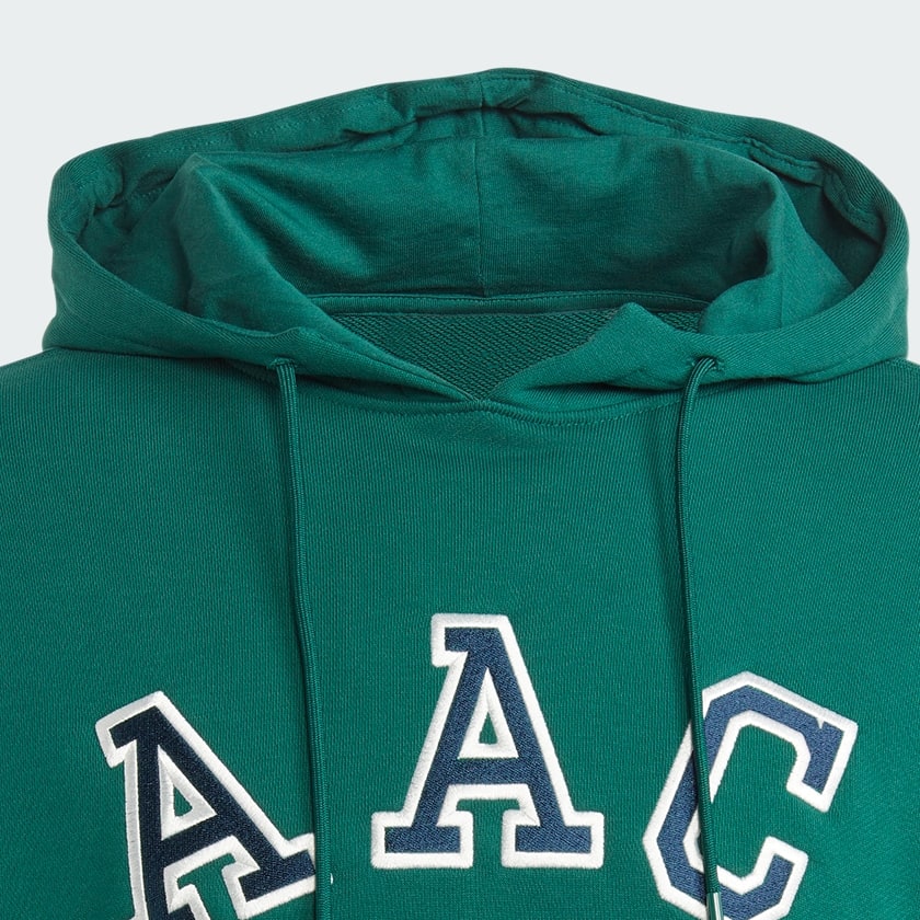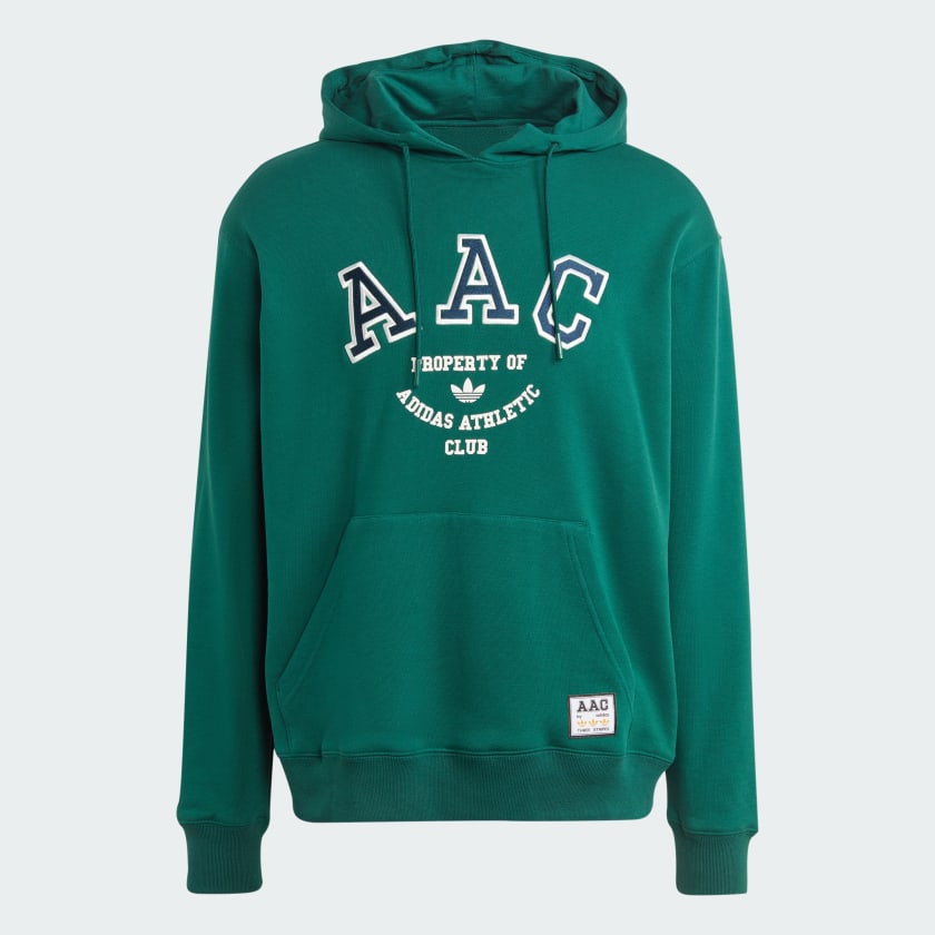 The rich Collegiate Green color is perfectly complemented by a bold graphic on the chest that reads “A A C PROPERTY OF ADIDAS ATHLETIC CLUB” in contrasting white and navy appliqué/print. Made from a comfortable, soft cotton-blend fleece material, it’s designed for warmth and all-day comfort.