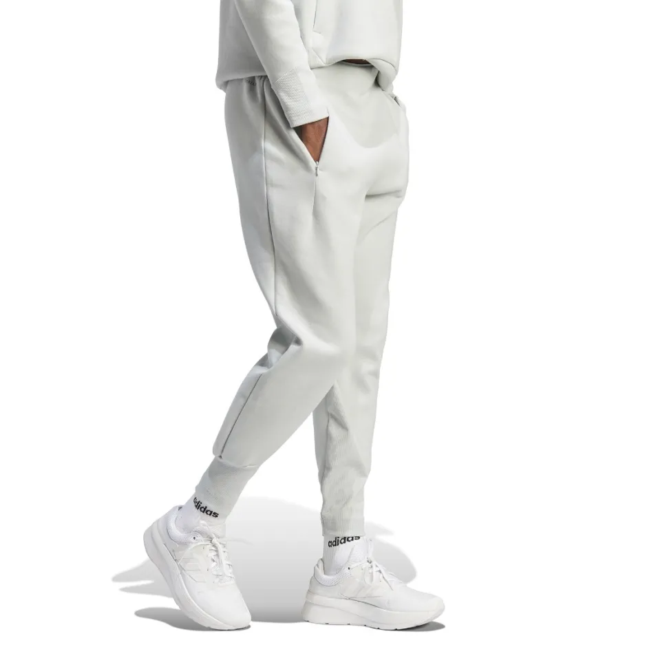 The pants feature a modern, tapered fit that is roomy at the hip and narrows sharply to the extended ribbed cuffs, creating a streamlined silhouette perfect for travel, warm-ups, or dedicated downtime. Functional details include a drawcord on the elastic waist and secure front zip pockets to keep essentials safe. The subtle black Adidas Badge of Sport completes the focused, distraction-free design of the Z.N.E. collection.