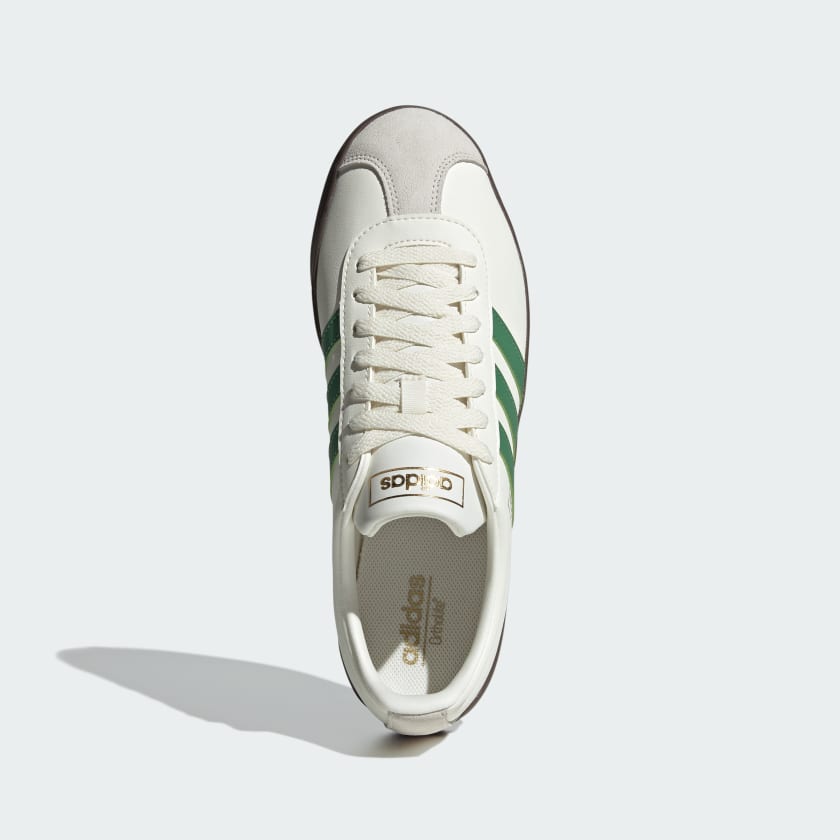 Embrace timeless skate-inspired style with the Adidas VL Court Classic shoes. These iconic sneakers feature a smooth, premium cream white leather upper, offering a versatile and clean aesthetic. The signature Adidas 3-Stripes are prominently displayed in a rich collegiate green, providing a striking contrast and authentic brand appeal. Gold foil “adidas” branding is subtly placed next to the stripes, adding a touch of classic detail. A durable suede T-toe overlay enhances the vintage look and offers extra resilience. The shoe is completed with a dark brown vulcanized rubber outsole that provides excellent grip and reinforces its classic, low-profile design. Perfect for everyday casual wear, the Adidas VL Court Classic effortlessly blends skate heritage with enduring comfort and style.