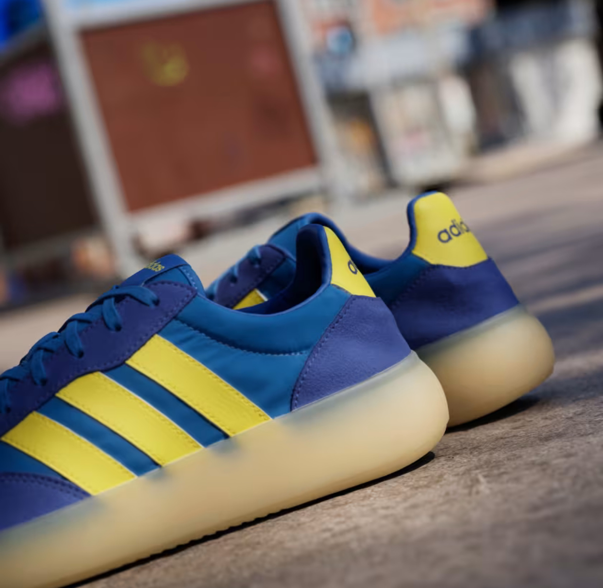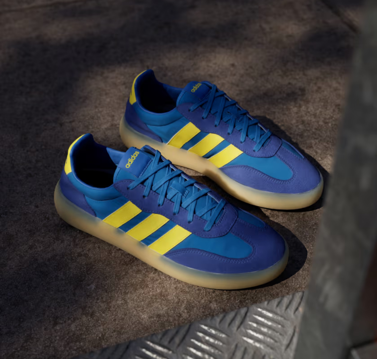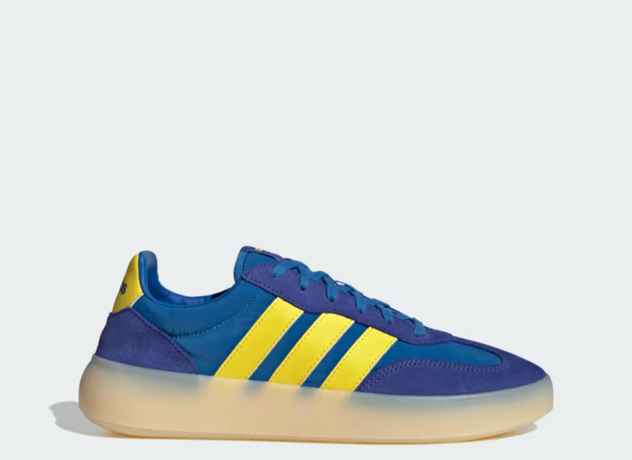 The adidas Barreda Decode is a sport-inspired lifestyle sneaker that offers a fresh, modern spin on the classic T-toe silhouette. This specific colorway features a vibrant blue upper constructed from a premium blend of suede and nylon, providing both durability and a lightweight, breathable feel. Bold yellow leather 3-Stripes and a matching heel tab provide a high-contrast look rooted in heritage terrace style.