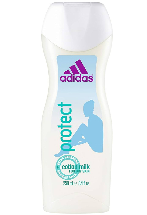 Pamper your dry skin with the Adidas Protect Shower Milk Cotton Milk. This extra hydrating shower gel is formulated to gently cleanse and nourish, leaving your skin feeling soft and moisturized. The creamy texture and delicate scent provide a soothing shower experience. The bottle features the Adidas logo and clearly indicates it’s “for dry skin” and contains “Cotton Milk”.