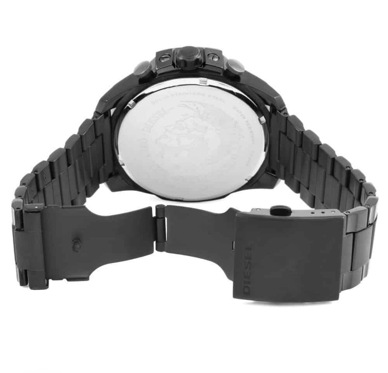 This imposing Diesel Mega Chief Chronograph (Model: DZ4477) makes a powerful statement with its distinct industrial aesthetic. It features a large, round stainless steel case and matching three-link bracelet, finished in a modern gunmetal/silver tone. The vibrant blue sunray dial is the focal point, contrasting sharply with the three chronograph sub-dials and the bold ’12’ hour marker. The dial also displays the iconic “ONLY THE BRAVE” tag and includes a date window. The watch is equipped with a precise quartz movement and is protected by a substantial crown guard etched with “DIESEL 10BAR”, indicating a water resistance of up to 100 meters. At a striking 51mm case size, this timepiece is designed for the man who prefers a commanding and stylish accessory.