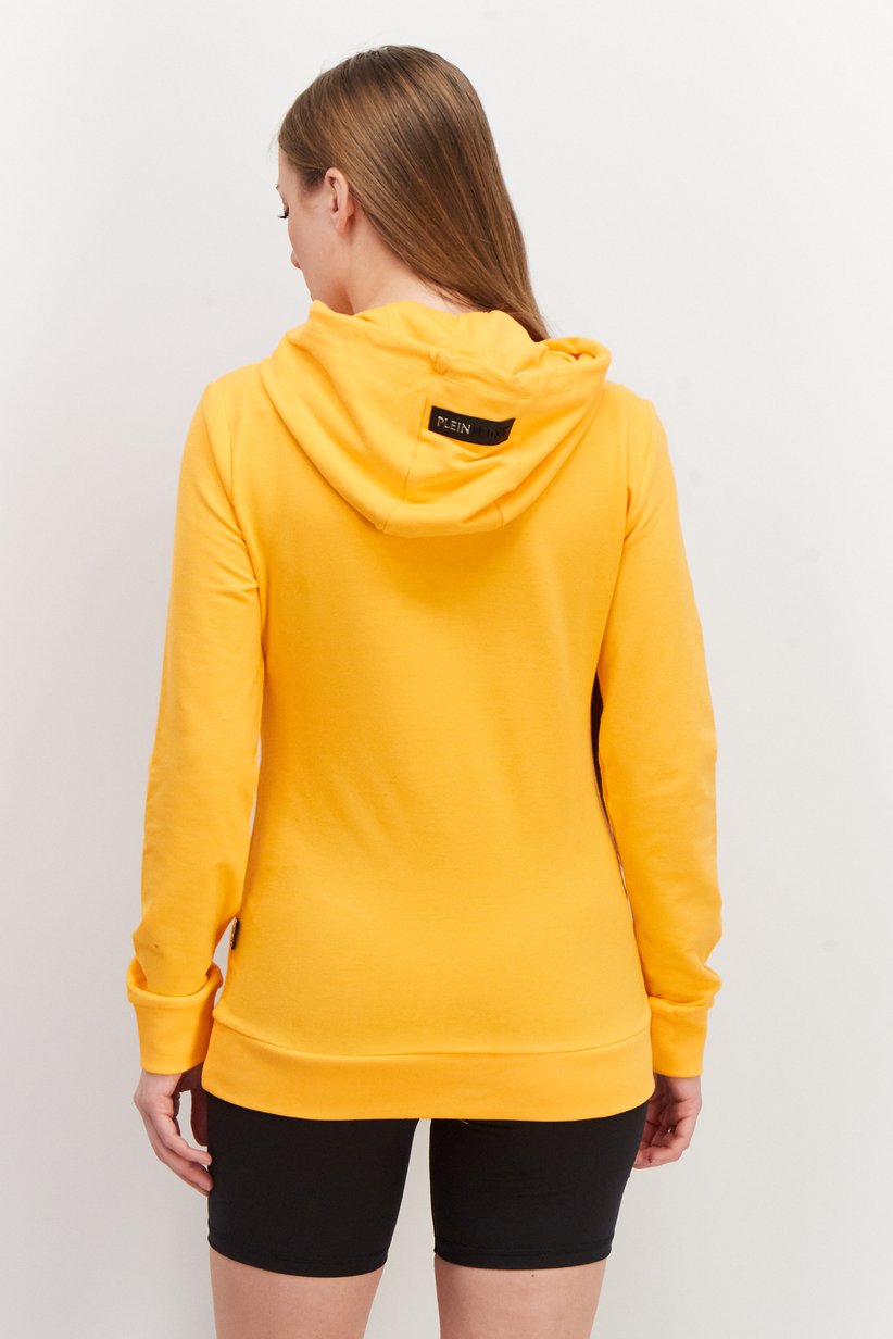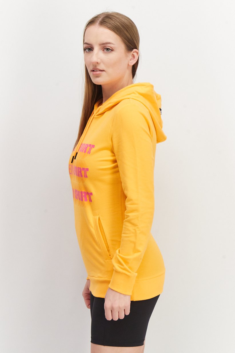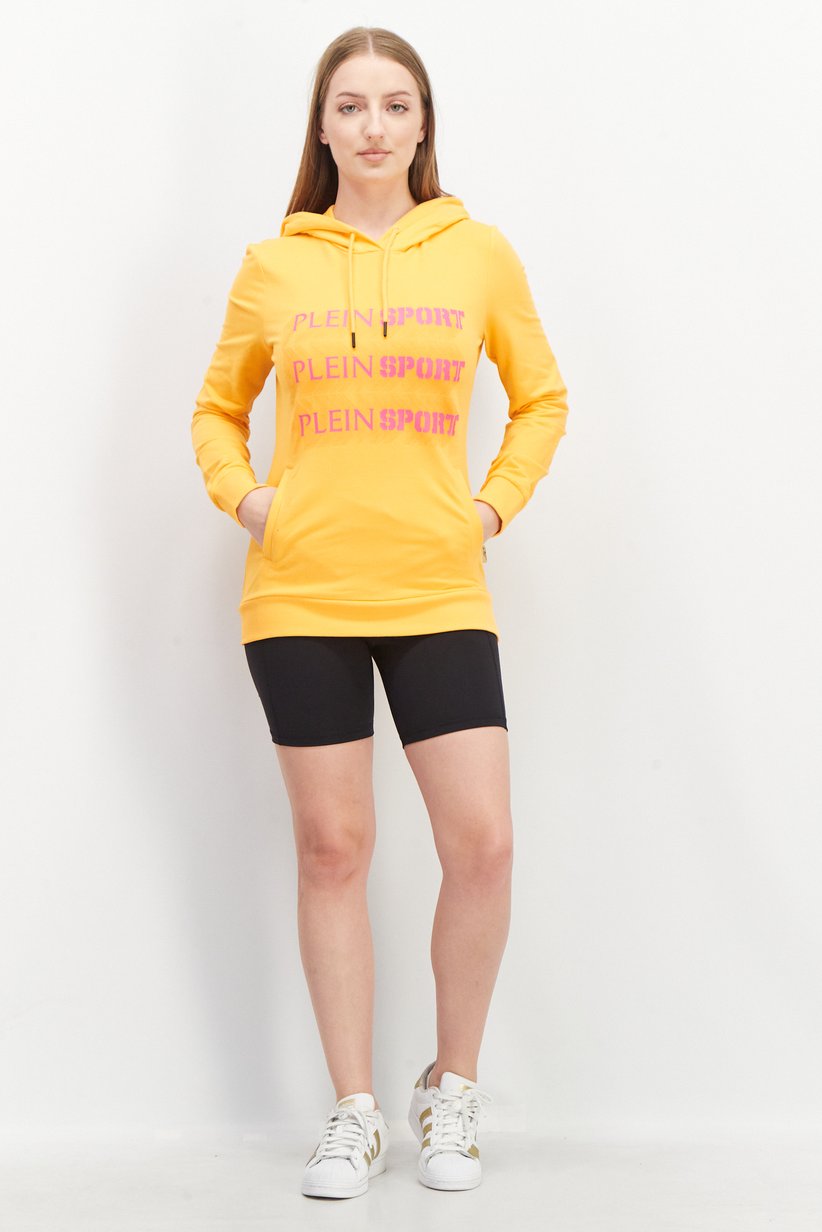 Step out in bold, athletic style with the Plein Sport Women’s Pullover Hoodie. This striking sweatshirt features a vibrant golden yellow color that instantly stands out. The front is decorated with the repeated ‘PLEIN SPORT’ logo printed in a contrasting, eye-catching hot pink font, creating a distinctive, modern look. It is designed with a comfortable hood featuring adjustable drawstrings, a spacious kangaroo-style front pocket to keep your hands warm or store essentials, and long sleeves finished with ribbed cuffs. The soft fabric offers all-day comfort, making it an excellent choice for a workout, casual layering, or running errands. Pair it with bike shorts or leggings for a complete sporty outfit.