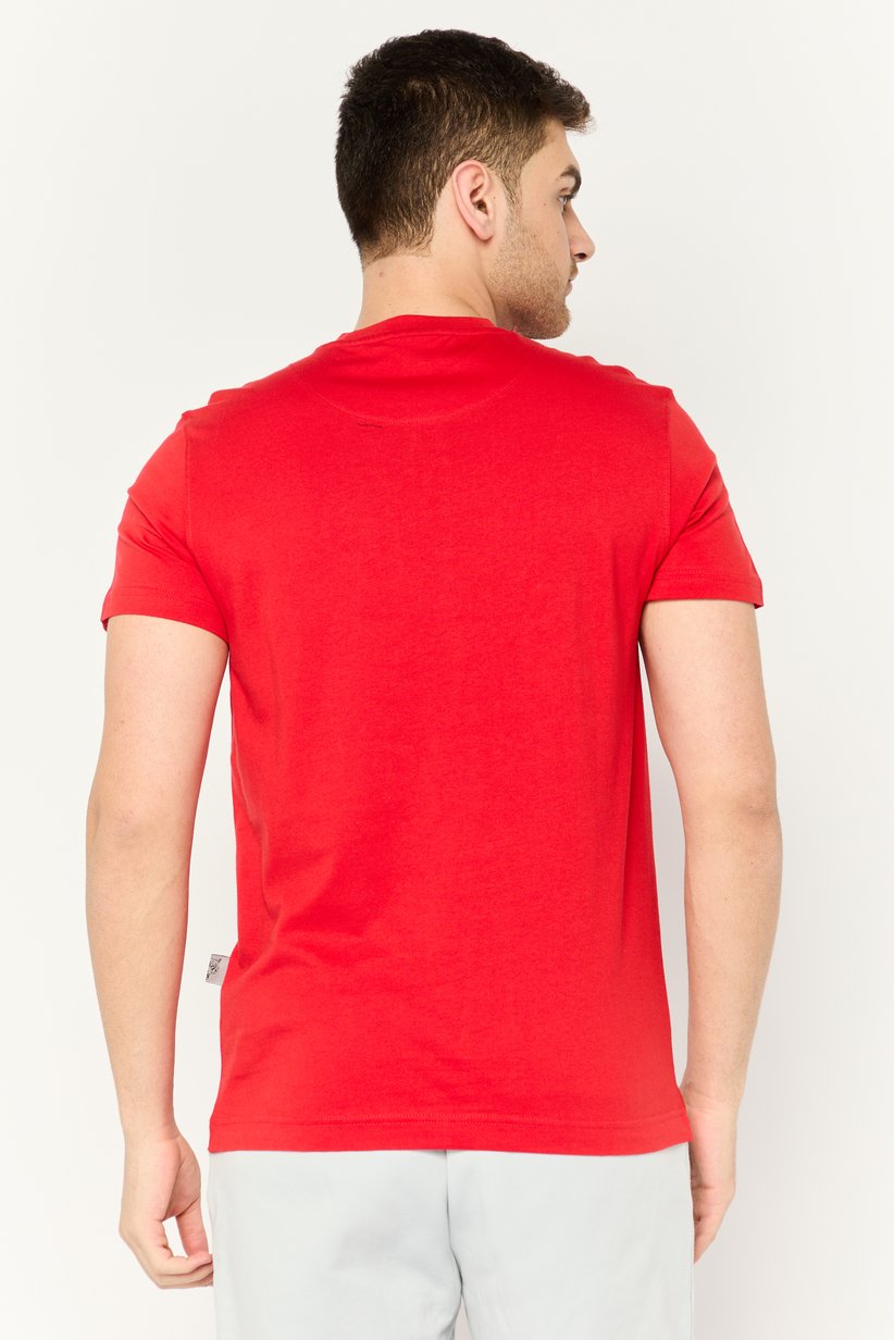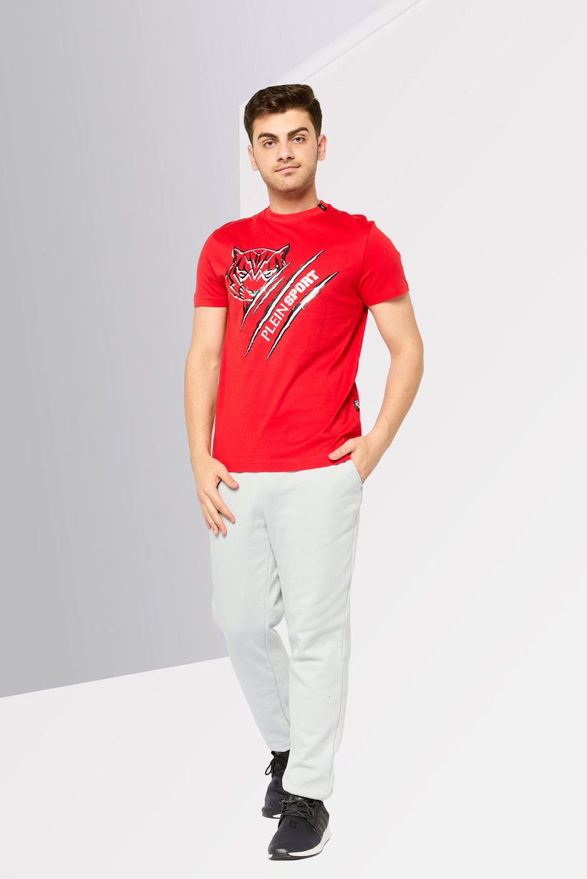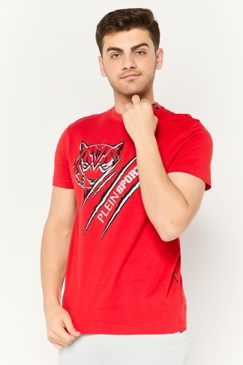 This is a vibrant red crewneck T-shirt for men from the brand Plein Sport. The shirt features a bold graphic on the front, showcasing a stylized, fierce black and white tiger head. The brand’s name, “PLEIN SPORT,” is printed vertically on a dynamic stripe pattern below the tiger. Made from a comfortable, breathable fabric, this short-sleeved tee is a stylish choice for casual wear.