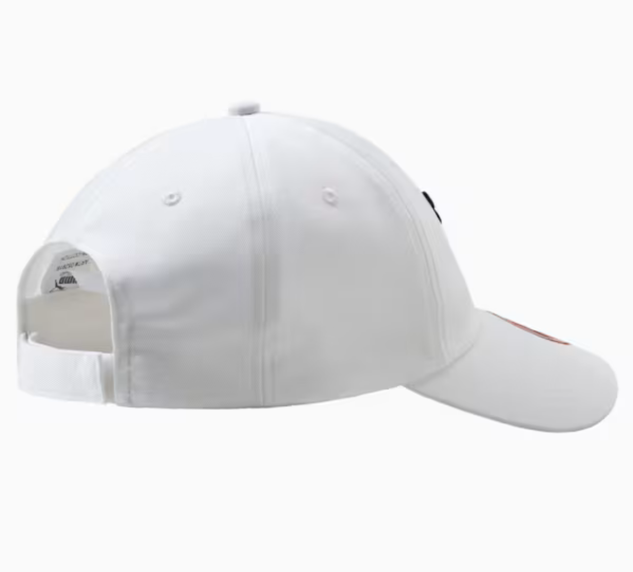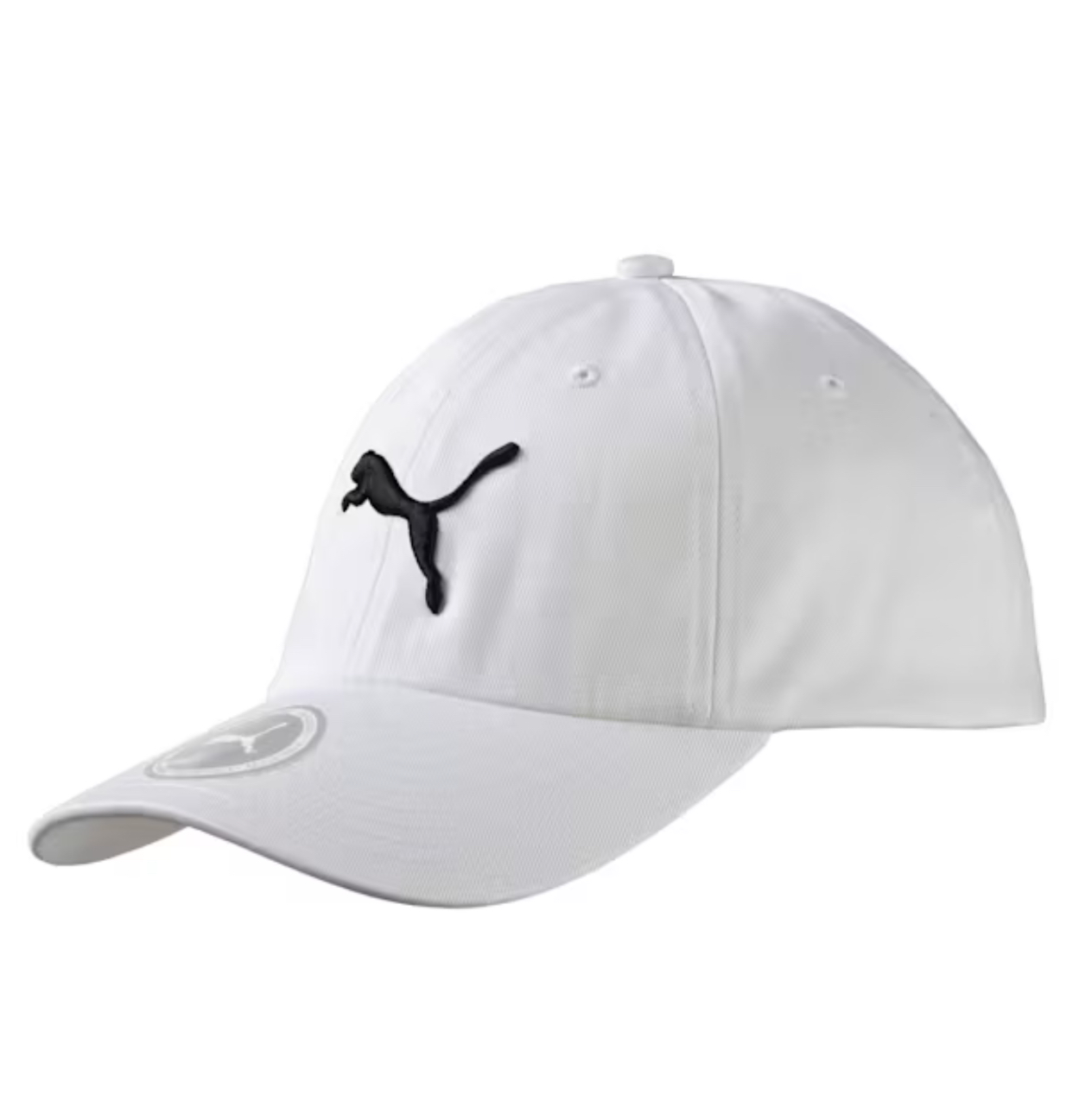 This Puma ESS Cap is white with a black embroidered Puma cat logo on the front. It’s a classic six-panel baseball cap design with a curved brim. It likely features an adjustable closure at the back for a customizable fit. This cap offers a simple and sporty look.