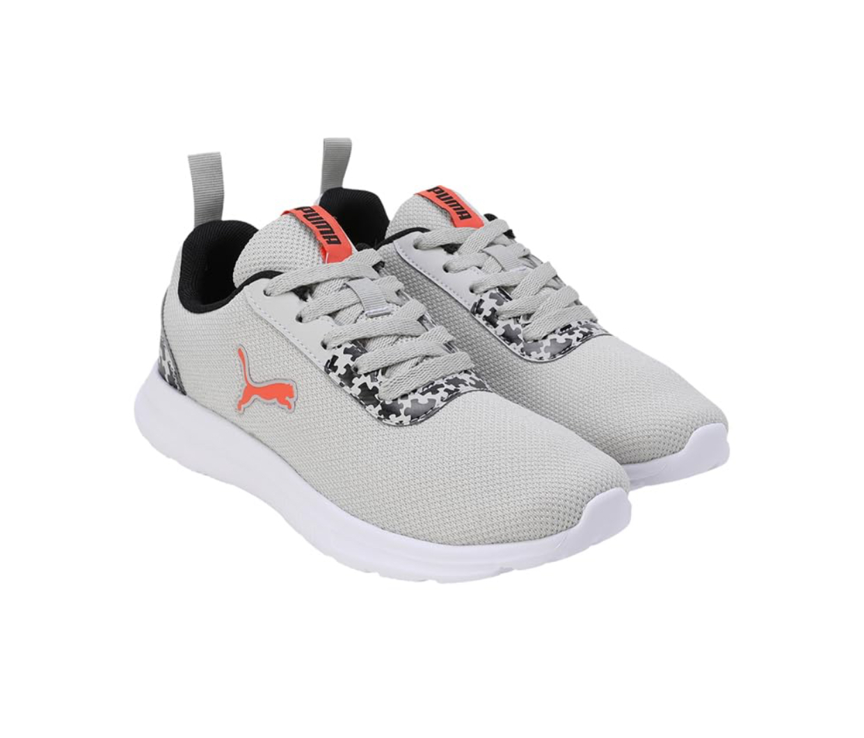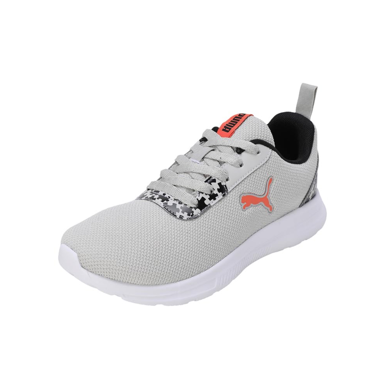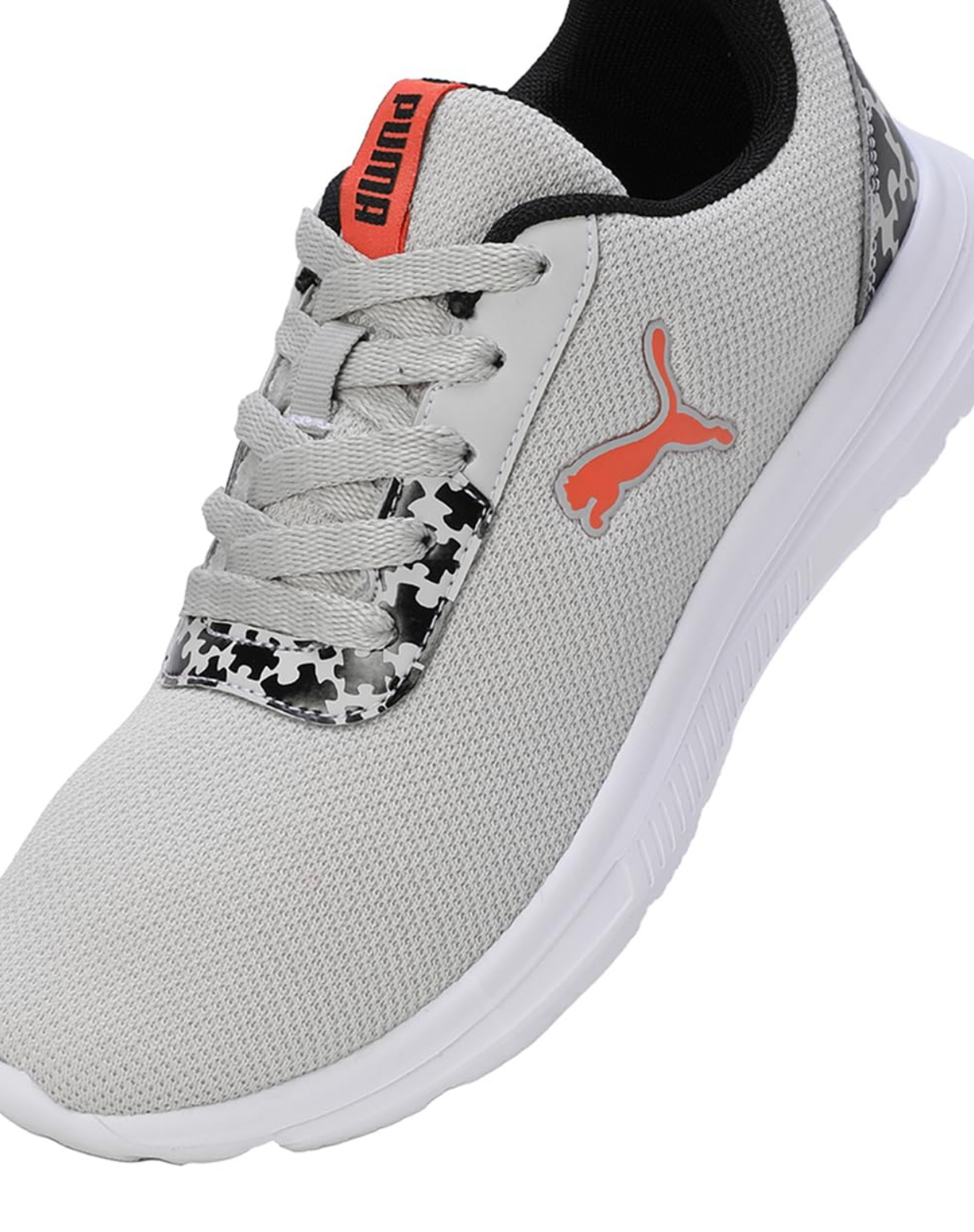 Step up your style and comfort with these Puma women’s running shoes, featuring a sleek light grey mesh upper for superior breathability. The iconic orange Puma cat logo stands out on the side, complementing the vibrant red “PUMA” branding on the tongue tag. Designed for performance and everyday wear, these sneakers incorporate a secure lace-up closure and a lightweight white sole that offers excellent cushioning and support. Subtle black and white puzzle-piece patterned accents near the eyelets and on the heel add a unique, modern touch, making these shoes a versatile addition to your athletic or casual wardrobe.