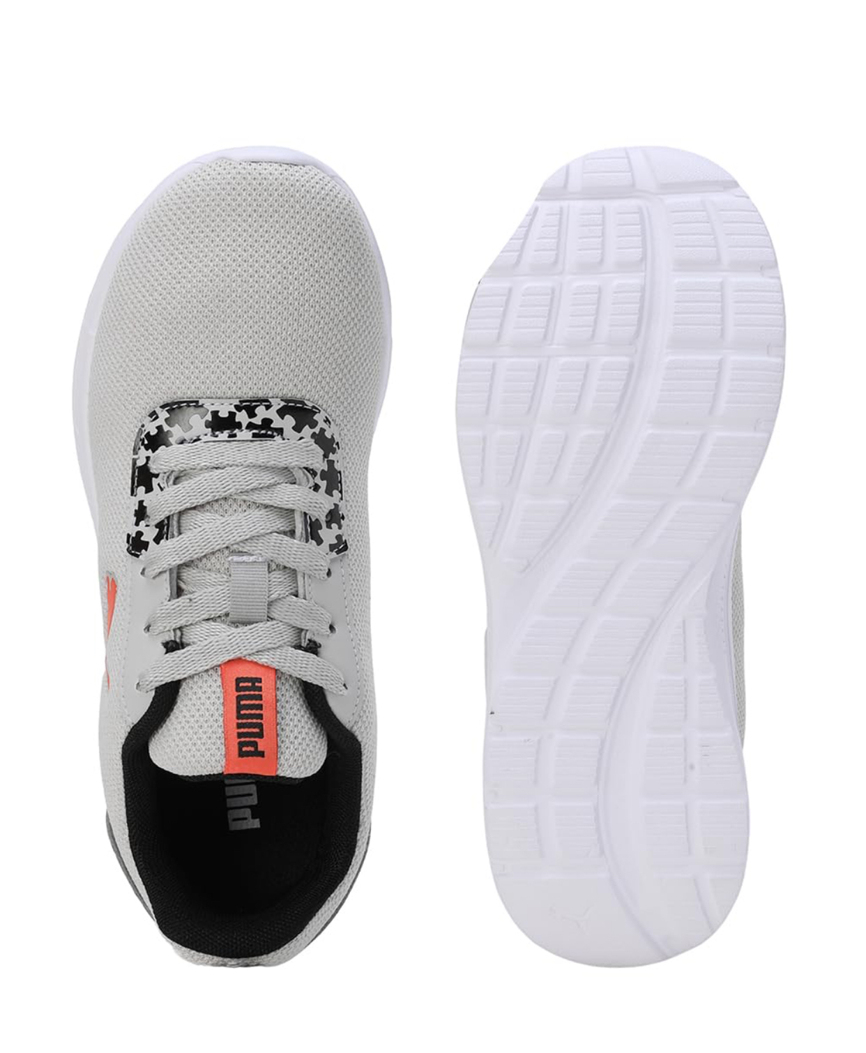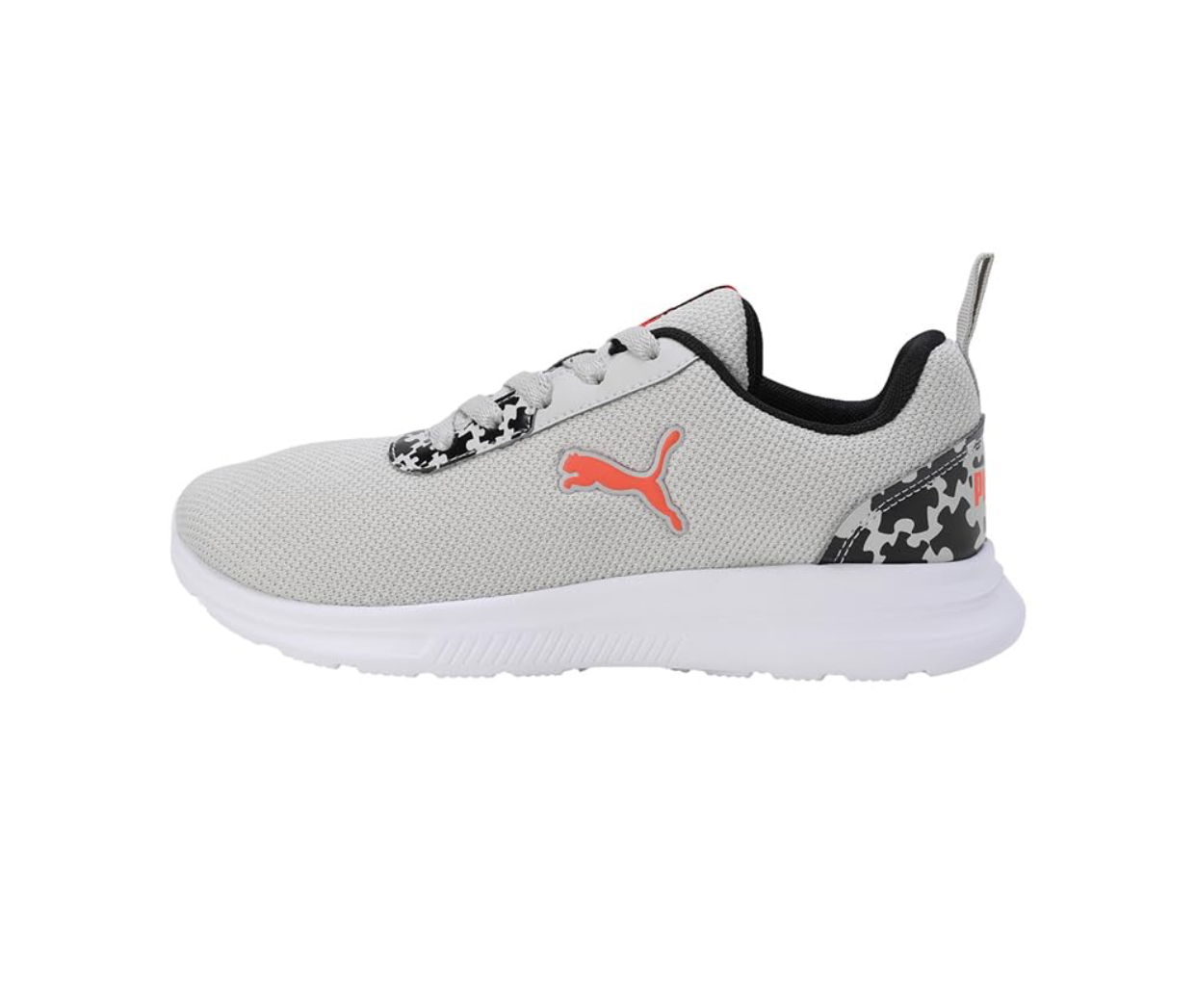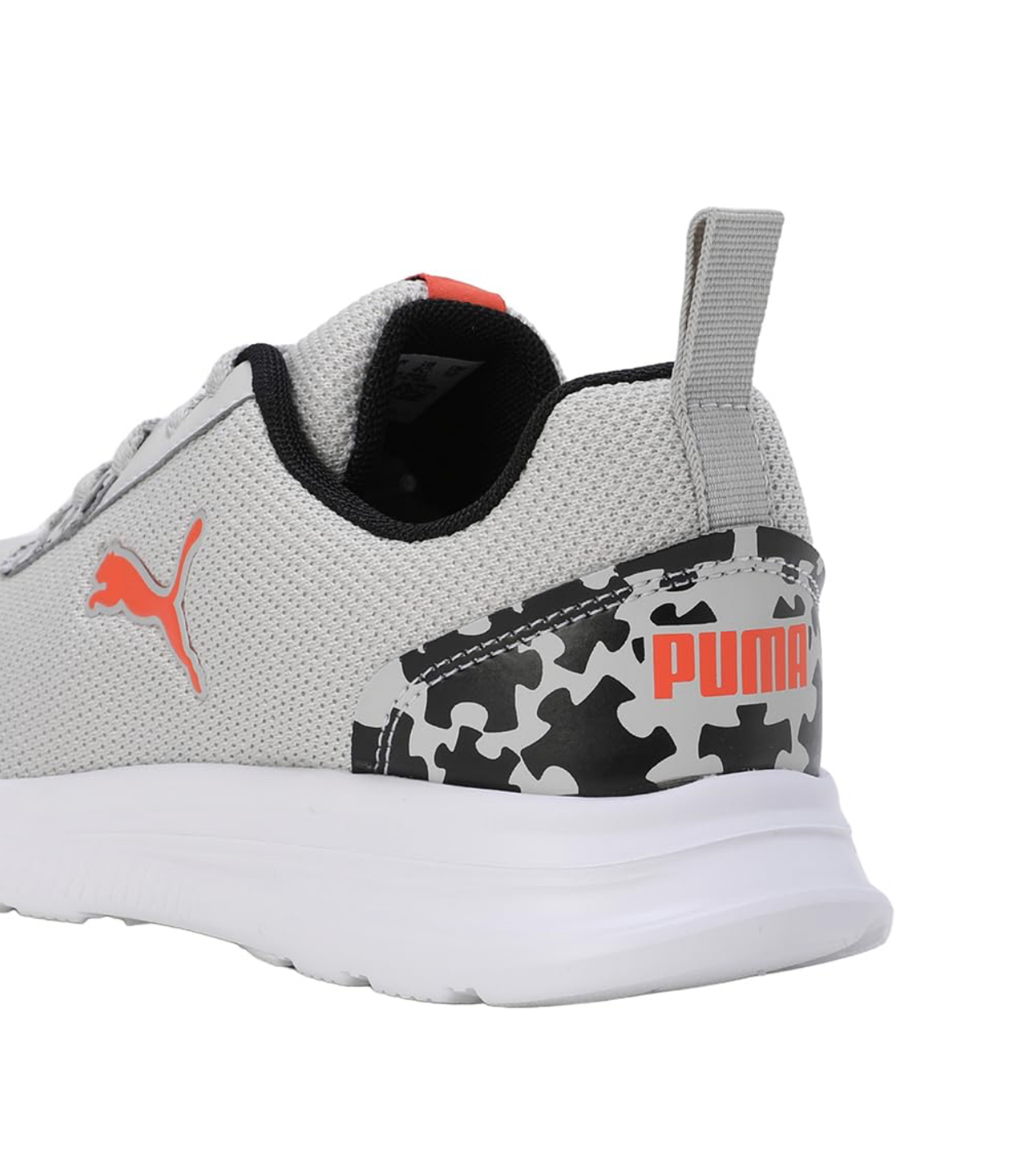 Step up your style and comfort with these Puma women’s running shoes, featuring a sleek light grey mesh upper for superior breathability. The iconic orange Puma cat logo stands out on the side, complementing the vibrant red “PUMA” branding on the tongue tag. Designed for performance and everyday wear, these sneakers incorporate a secure lace-up closure and a lightweight white sole that offers excellent cushioning and support. Subtle black and white puzzle-piece patterned accents near the eyelets and on the heel add a unique, modern touch, making these shoes a versatile addition to your athletic or casual wardrobe.