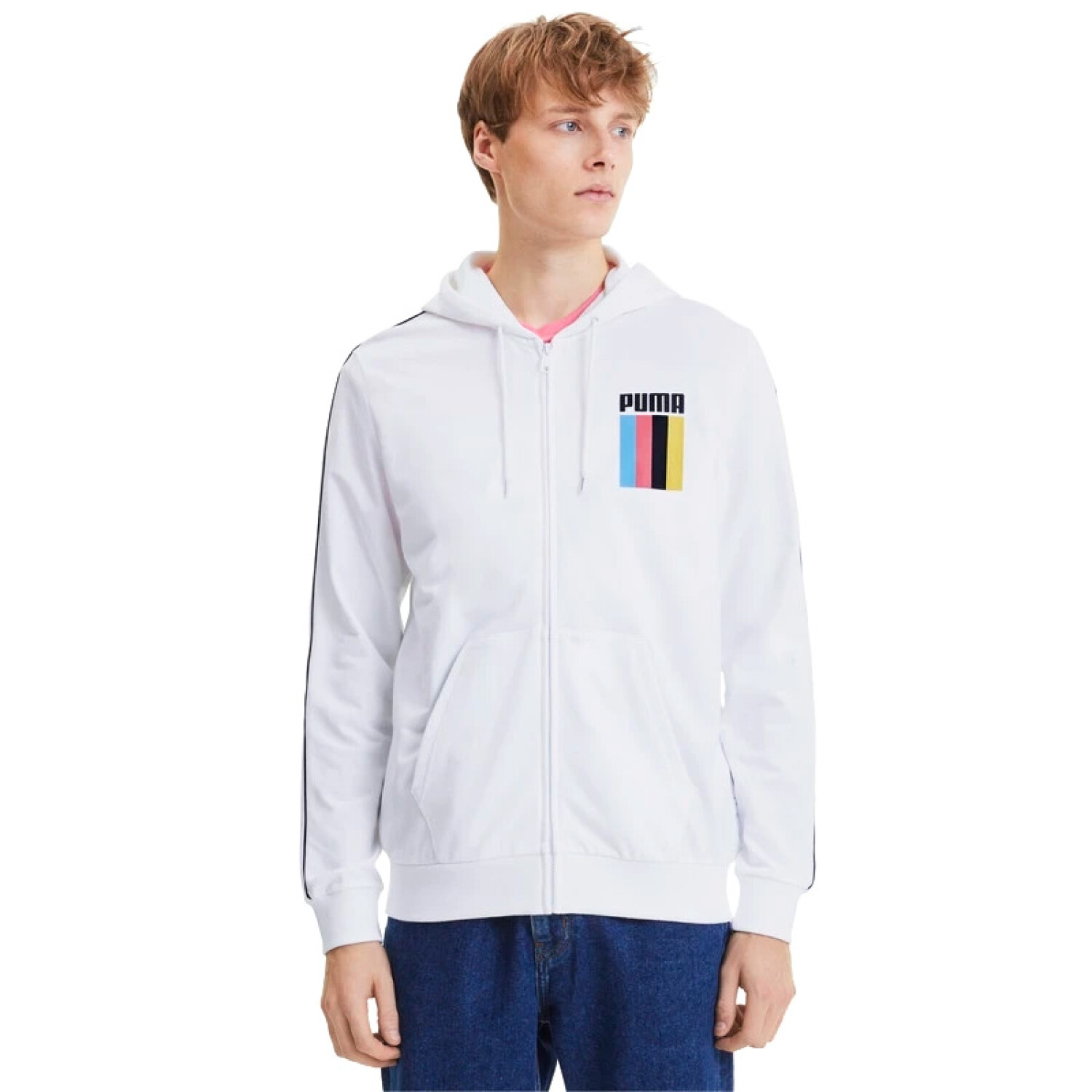 Celebrate in style with the PUMA Men’s Celebration Full-Zip Hoodie. This white hoodie features a unique and vibrant graphic on the chest, adding a pop of color to your sporty look. Designed with a full zipper and hood for versatile wear, it’s perfect for layering or wearing on its own. The PUMA logo and design elements showcase its athletic heritage. Made for comfort and style, this hoodie is ideal for everyday wear or workouts.