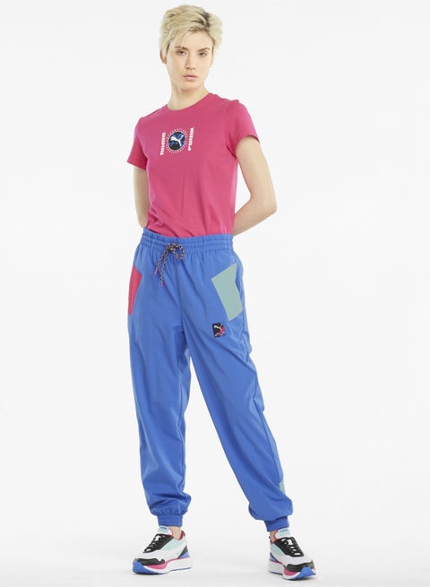 The striking royal blue base is accented by geometric color-blocked panels in hot pink and mint green, delivering a high-energy “varsity” vibe. An adjustable drawstring waistband and elasticated cuffs ensure a personalized, secure fit, whether you’re hitting the streets or lounging in style. Finished with a unique woven PUMA International badge on the thigh, these track pants are a standout addition to any activewear collection.