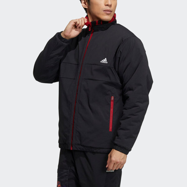 Adidas Men’s Reversible AOP Boa Fleece Jacket - Sports Stand Collar Windbreaker in Black & Deep Red-Adidas H39241